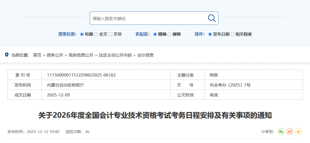 关于2026年度全国会计专业技术资格考试考务日程安排及有关事项的通知