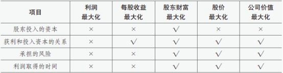 如果投入资本相同、利润取得的时间相同、获得利润承担的风险也相同,利润最大化是一个可以接受的观念。事实上,许多公司都把提高利润作为公司的短期目标,该目标具有一定的现实意义。