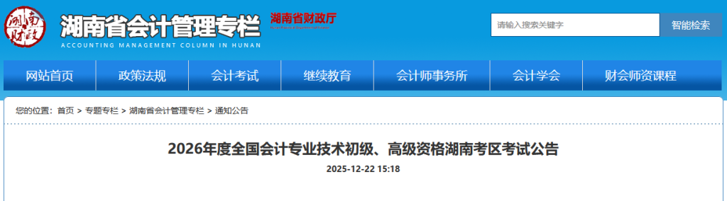 2026年度全国会计专业技术初级、高级资格湖南考区考试公告