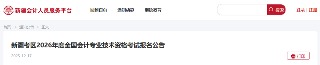新疆考区2026年度全国会计专业技术资格考试报名公告