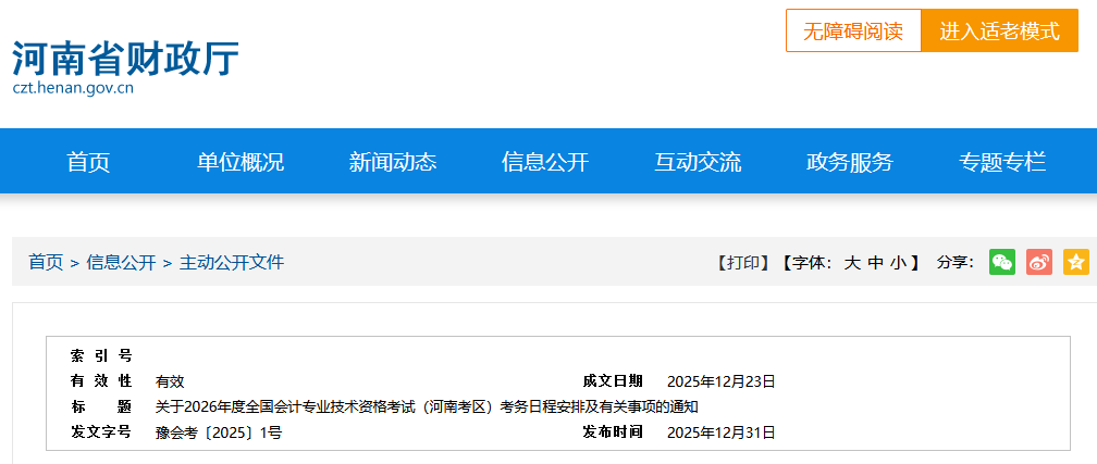 关于2026年度全国会计专业技术资格考试(河南考区)考务日程安排及有关事项的通知