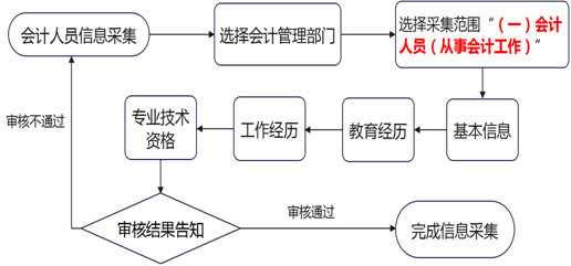 答:新用户在全国平台完成“注册-登录-实名认证”的准备工作后,点击首页的“会计人员信息采集”可进入到信息采集页面。(如何完成全国平台“注册-登录-实名认证”等准备工作,详见问题6)