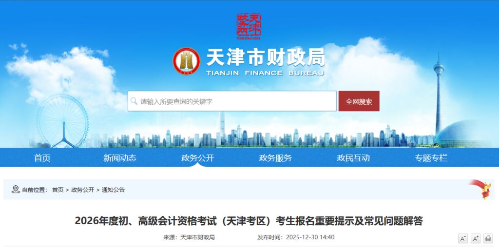 2026年度初、高级会计资格考试(天津考区)考生报名重要提示及常见问题解答手