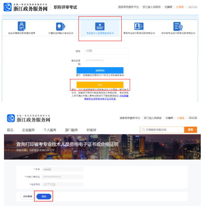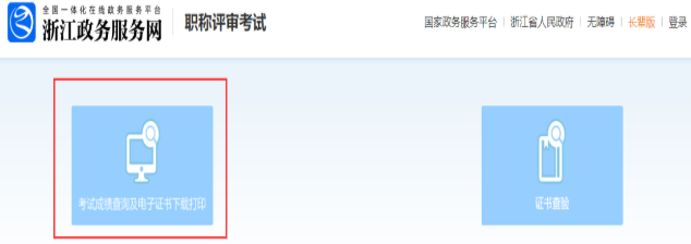 1.请考生登录浙江政务服务网,搜索“职称评审考试”栏目(网址:https://mapi.zjzwfw.gov.cn/web/mgop/gov-open/zj/2002238385/reserved/index.html)——点击“考试成绩查询及电子证书下载打印”。