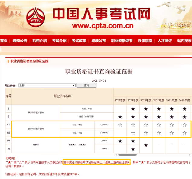 2.中国人事考试网提供全国专业技术人员职业资格证书查询验证(网址http://www.cpta.com.cn/certDown2024.html),根据其公布的范围:初中级证书已开通线上查询验证服务、但还不支持电子证书下载。电子证书或考试合格电子证明下载服务目前需通过浙江政务服务网获取。