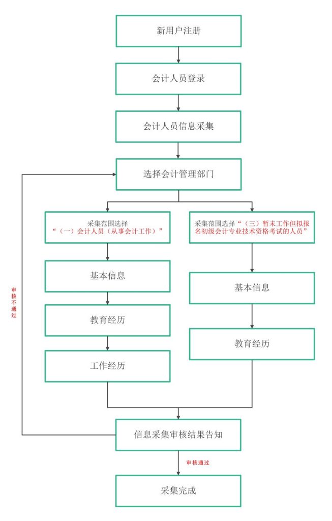 如对信息采集具体要求存在疑问请咨询当地会计管理部门,如审核不通过请根据所属会计管理部门审核意见进行修改后,重新提交审核。信息采集审核通过后,待考试报名入口开通后即可通过平台“会计专业技术资格考试”模块进行考试报名。