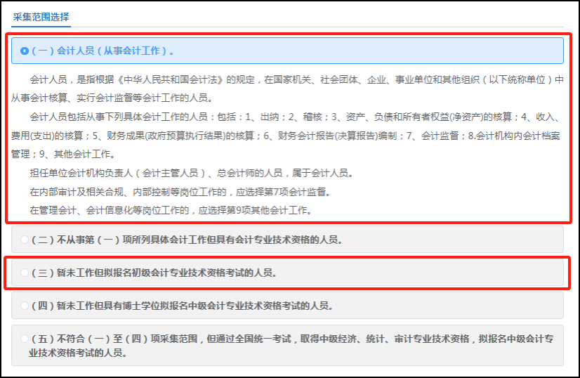 请仔细阅读“采集须知——采集范围选择”,并结合个人实际情况选择。凡有过会计工作经历(无论现在是否在职在岗)均可选择(一)会计人员;从未有过会计工作经历的请选择(三)暂未工作但拟报名初级会计专业技术资格考试的人员。完成采集范围选择后点击“保存并下一步”进入到基本信息页。