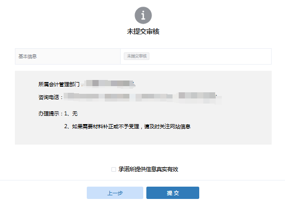 审核告知页面会显示审核状态以及所属会计管理部门及联系方式,核对信息无误后,请勾选“承诺所提供信息真实有效”后提交采集信息。