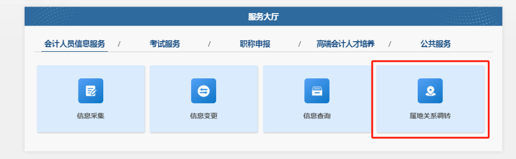 信息采集审核通过的人员如有需进行属地调转的,可点击首页的会计人员属地关系调转进入到会计人员信息调转页面,或者点击会计人员信息服务-属地关系调转。