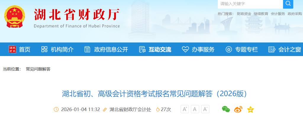 各位湖北2026年初级会计考生们,备考之路已开启,报名环节可是关键一步!湖北省财政厅会计处发布了《湖北省初、高级会计资格考试报名常见问题解答(2026版)》,小编这就带大家详细了解,助力大家顺利报名!