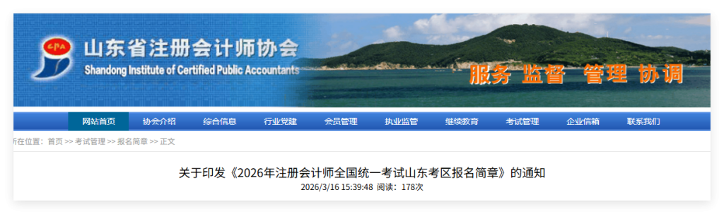 根据财政部注册会计师考试委员会发布的《2026年注册会计师全国统一考试报名简章》和《注册会计师全国统一考试办法》相关规定,结合我省考试工作有关要求,现将山东考区2026年注册会计师全国统一考试有关事项规定如下: