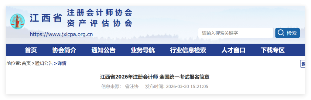 根据《注册会计师全国统一考试办法》和《财政部注册会计师考试委员会关于印发〈2026 年注册会计师全国统一考试报名简章〉的通知》要求,我会制定了《江西省2026年注册会计师全国统一考试报名简章》,现将考试报名有关事项规定如下: