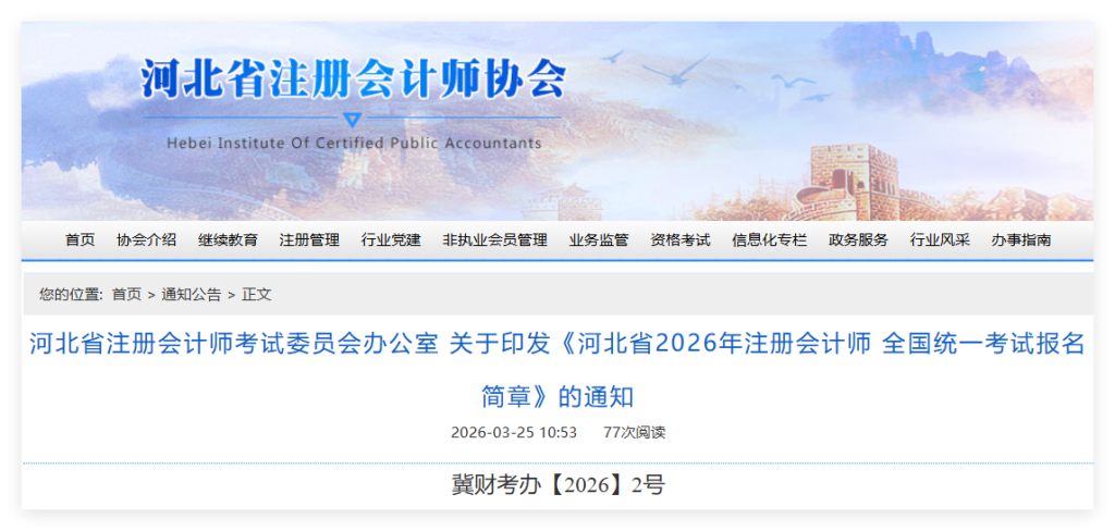 河北省注册会计师考试委员会办公室 关于印发《河北省2026年注册会计师 全国统一考试报名简章》的通知