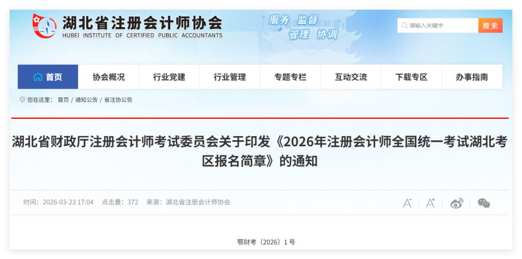 湖北省财政厅注册会计师考试委员会关于印发《2026年注册会计师全国统一考试湖北考区报名简章》的通知