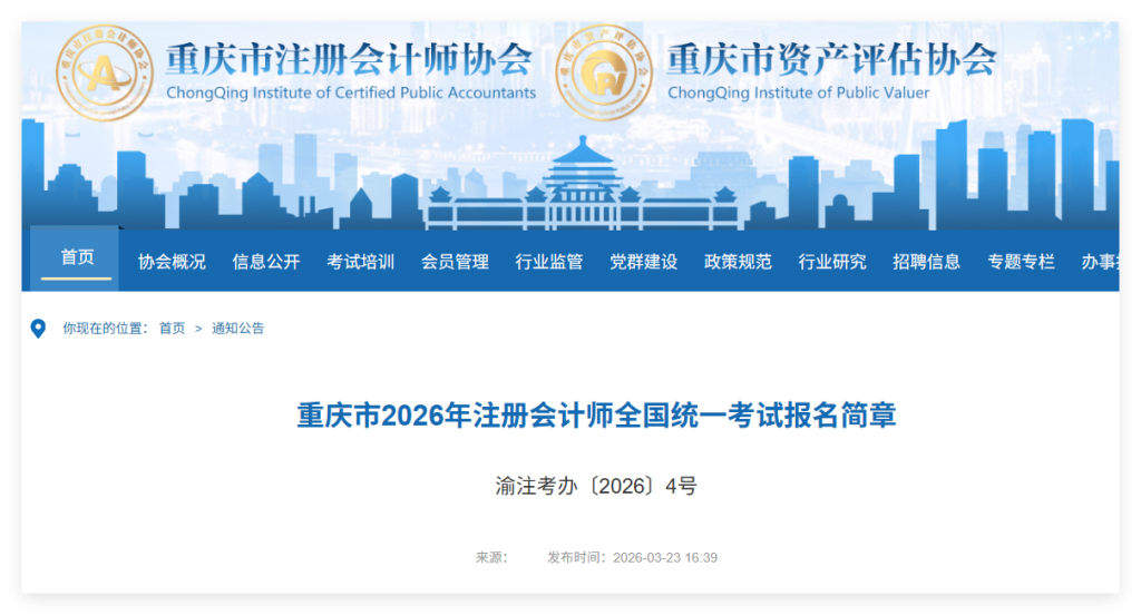重庆市注册会计师协会已正式发布《重庆市2026年注册会计师全国统一考试报名简章》,为重庆地区的考生们明确了本年度注会考试的报名时间、流程、考区设置及相关注意事项。小编在此提醒各位考生,务必牢记时间节点、规范操作,以免因流程失误影响报考。