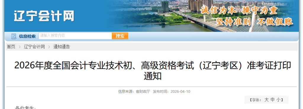 2026年度全国会计专业技术初、高级资格考试(辽宁考区)将于5月16日至18日举行,现就准考证打印有关事项通知如下: