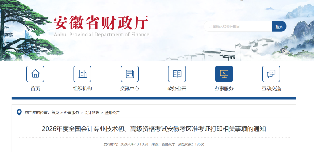 2026年度全国会计专业技术初、高级资格考试安徽考区准考证打印相关事项的通知