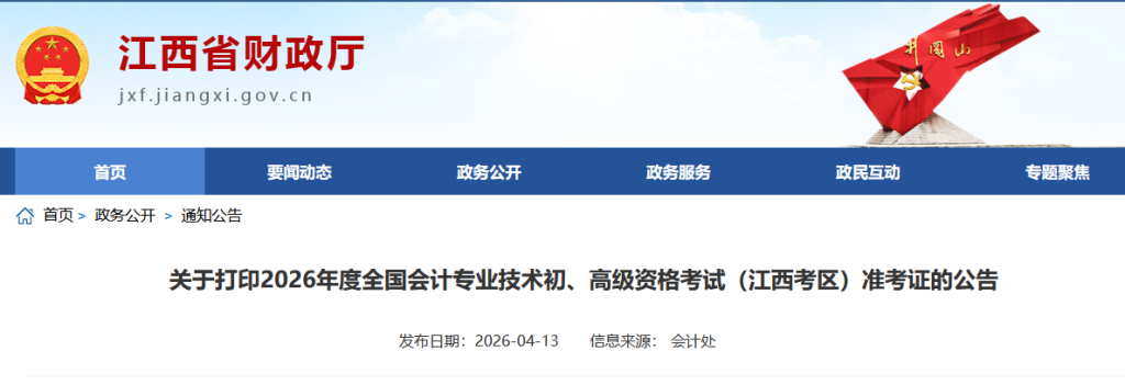 关于打印2026年度全国会计专业技术初、高级资格考试(江西考区)准考证的公告