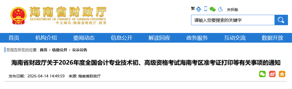 海南省财政厅关于2026年度全国会计专业技术初、高级资格考试海南考区准考证打印等有关事项的通知