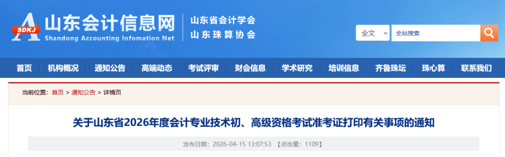 关于山东省2026年度会计专业技术初、高级资格考试准考证打印有关事项的通知